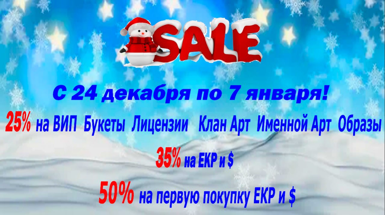 ​ Update: В честь грядущего праздника Нового года, акция на покупки игровых валют, скидки на арты, клан арты, букеты и т.д.